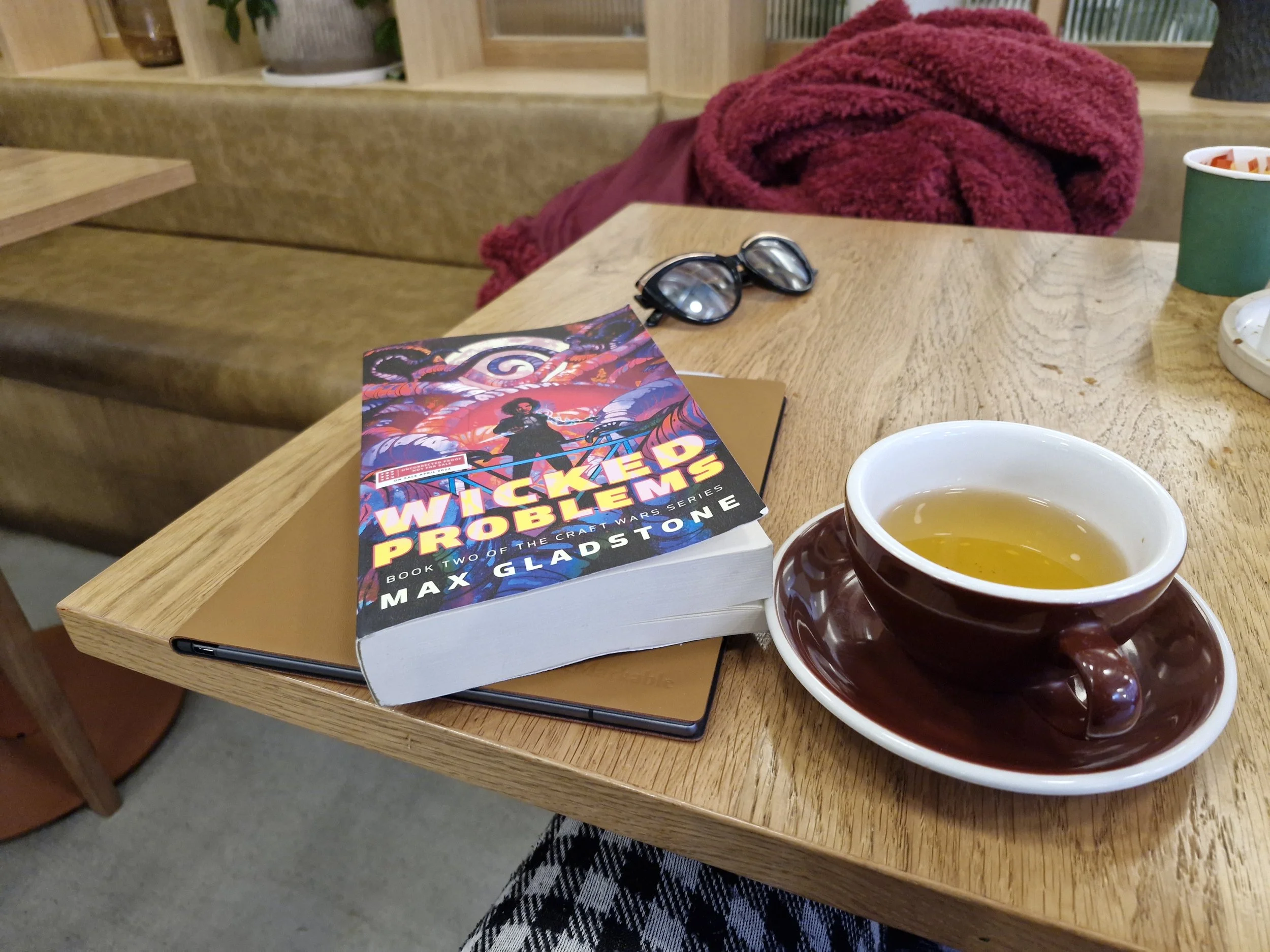 Barista just commented on the WICKED PROBLEMS book cover (he says it looks amazing and he wants them on his shelf). Am now loaning him THREE PARTS DEAD.